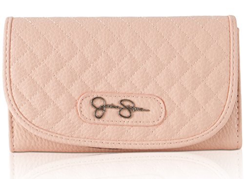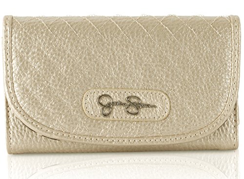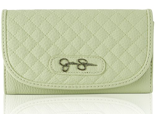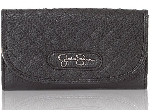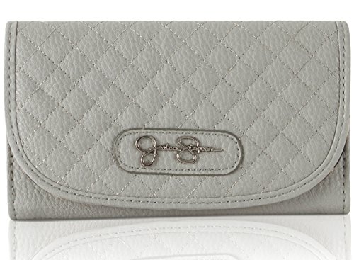 Carry your cash and cards in this classic Jessica Simpson Katie Flapover Wallet, Exterior Features; Quilted Design, Signature logo accent, and Snap Flapover closure, Interior features; 12 credit card and 1 ID slots, bill pocket and zippered coin pocket. Great for exceptional organization in sleek styling.