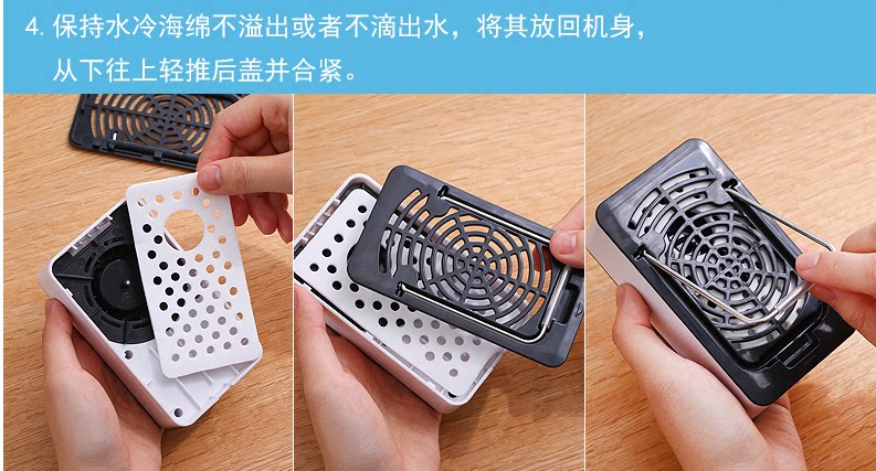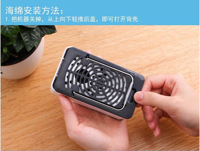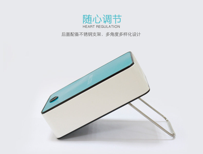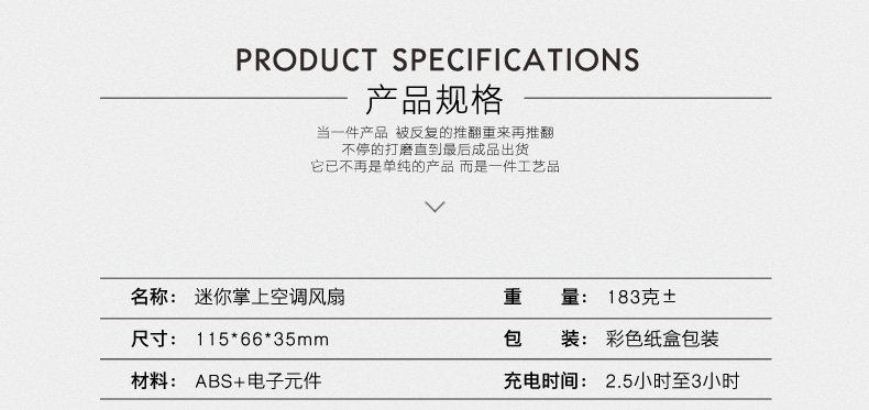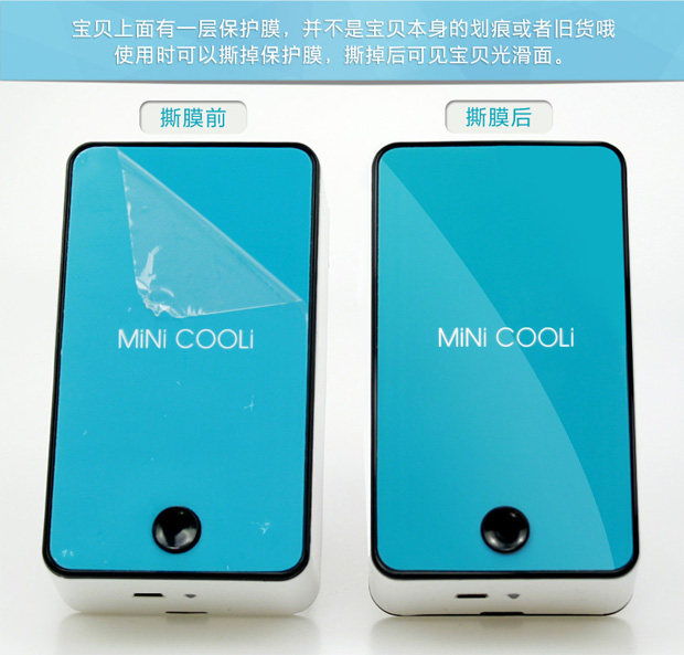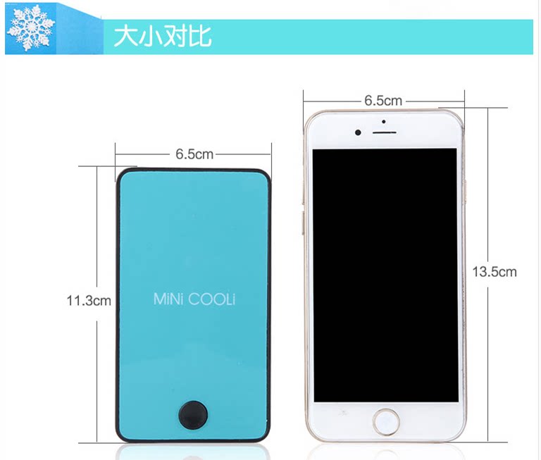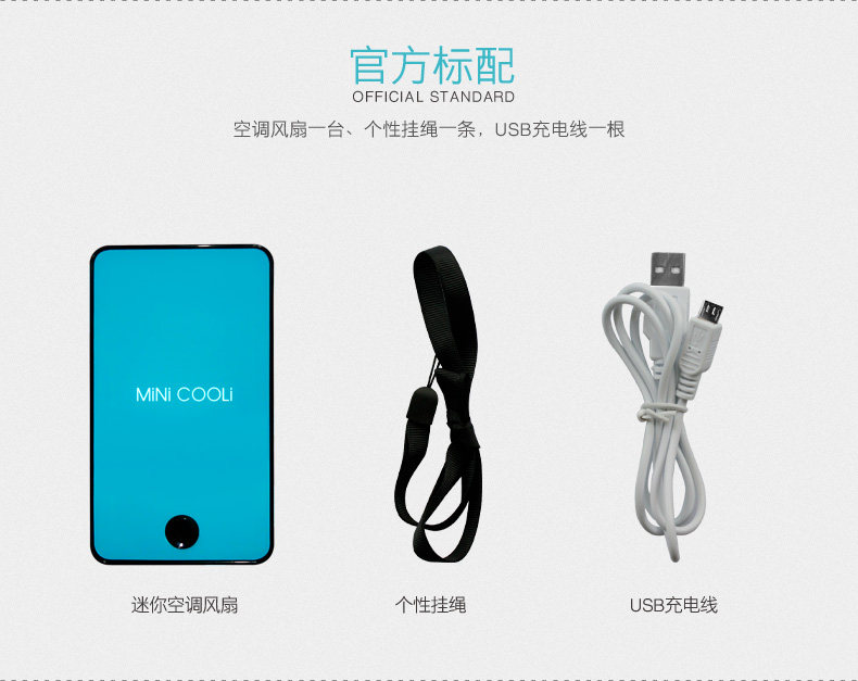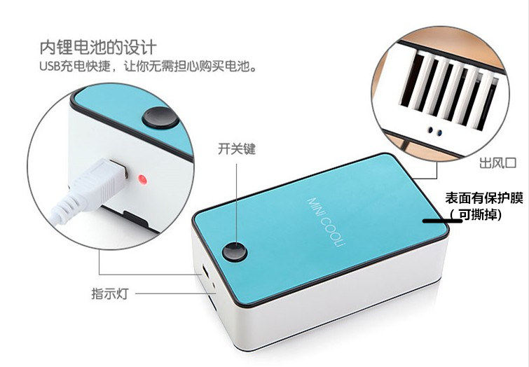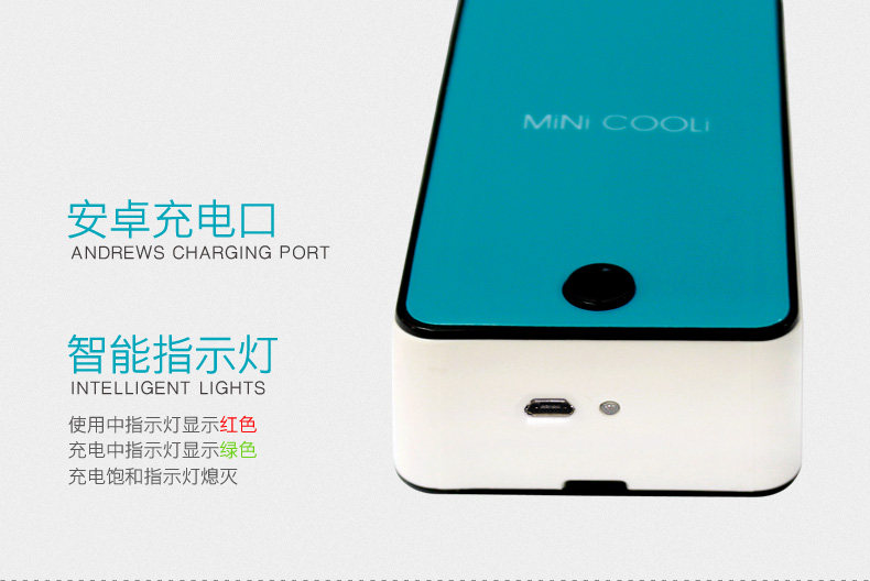 新款迷你掌上空调风扇,全面大升级:1、主键统一改为黑色;2、带充电提醒标志:充电时绿灯,充满后灯熄灭,使用时红灯亮;3、电池由原来的400毫安,改为1400毫安,充电2小时左右,可以连续使用6小时以内;4、配送USB线和挂绳;5、可以将内置的海绵用冰水浸湿,有效降低温度;6、可以用充电宝连接充电,也可以用手机充电器直接连接电源插座充电。