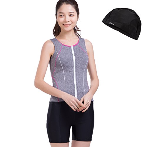 -. Feature : らくらく着脱♪ セパレート&ファスナータイプ フィットネス水着 / めくれ防止スナップで上着のめくれを防止しさらに安心、快適なスイムウェア♪ / バストを綺麗に見せる"美しパッド"仕様 円形厚型でスマートかつ綺麗に♪ / 胸パッドはずれ防止縫製 & パンツ全面の裏地付きで安心感UP♪ / 締め付けのすくない《ゆったりスイムキャップ》をおつけしています♪
