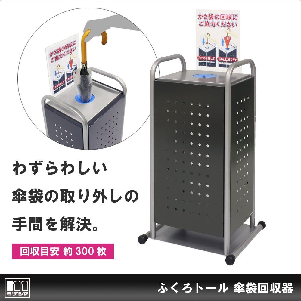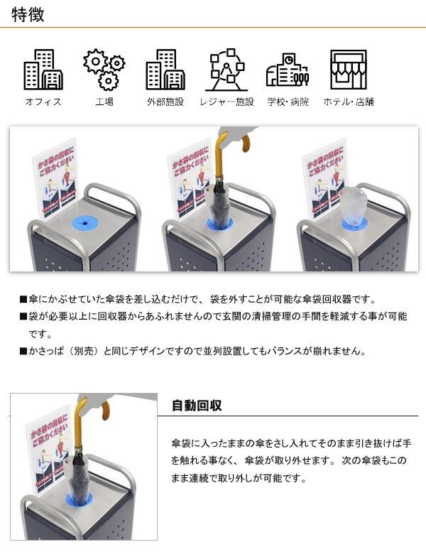 傘にかぶせていた傘袋を差し込むだけで、袋を外す事が可能な傘袋回収器です。袋が必要以上に回収器からあふれませんので玄関の清掃管理の手間を軽減する事が可能です。別売のかさっぱ(傘袋装着機)と同じデザインですので並列設置してもバランスが崩れません。 |