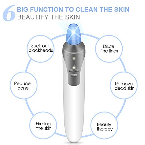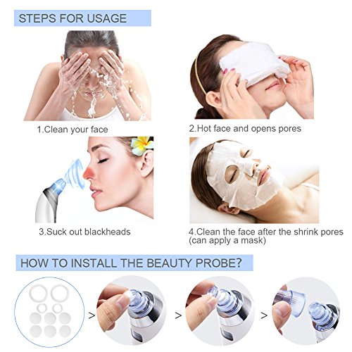 - MULTI-FUNCTIONAL DEVICE: The electric pore cleanser comes with 4 interchangeable probes, with 4 different functions. It can suck out blackheads, reduce the whiteheads, clear the bolt, reduce grease, tighten your skin, fine lines and reduce wrinkles.