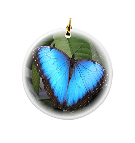 Rikki Knight Bright Blue Butterfly on Green Design Round Porcelain Two-Sided Christmas Ornaments