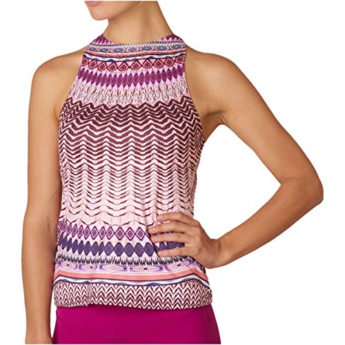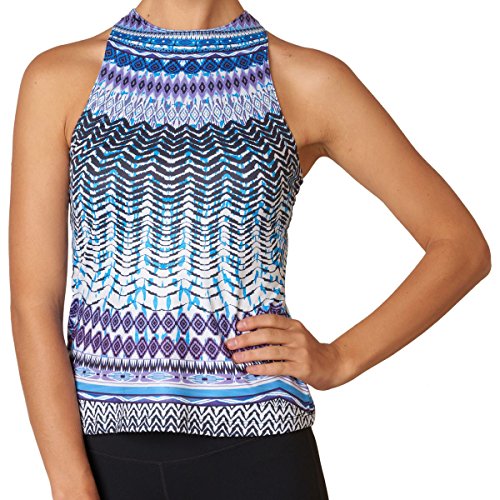 Lightweight performance knit top in boho pattern featuring high neckline and racer back