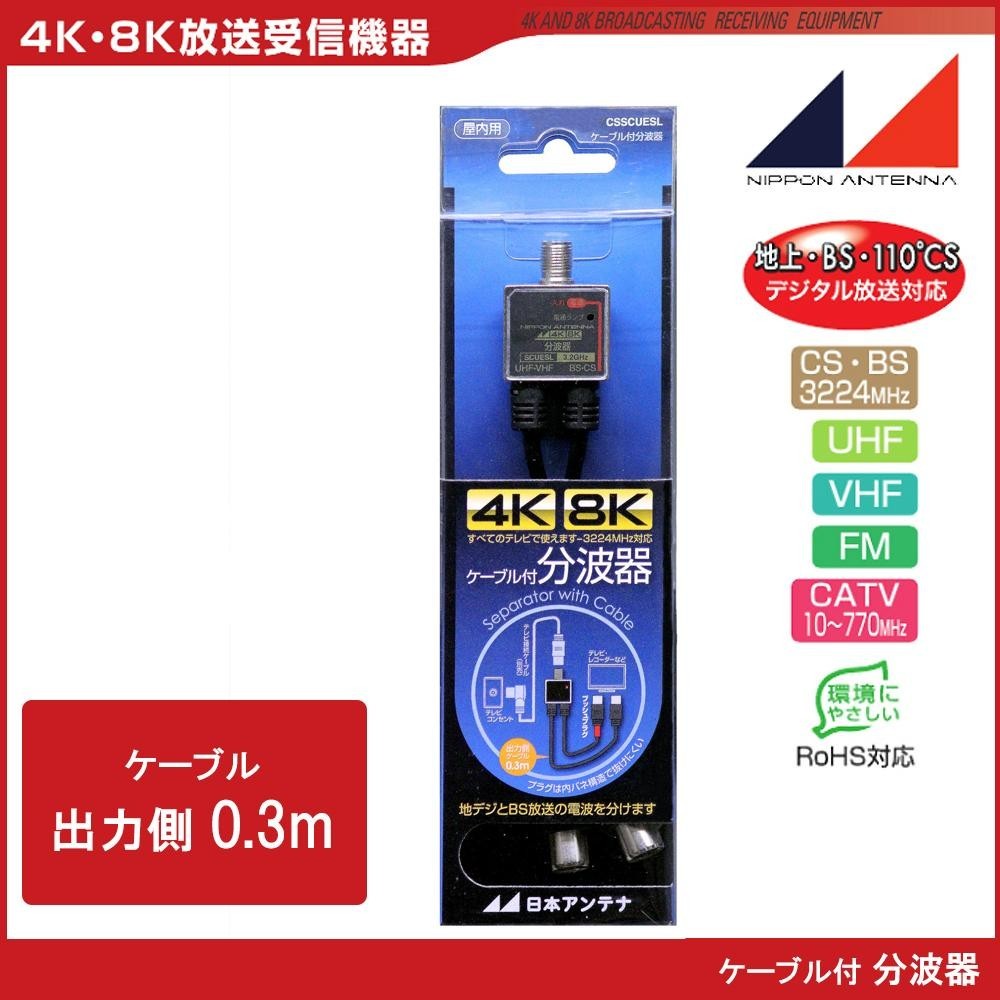 4K8K放送に対応!!地デジとBS放送の電波を分ける分波器です! 製造国:中国 素材・材質:合成樹脂 仕様:屋内用入力ケーブル:なし出力ケーブル(プッシュプラグ):30cm×2 ※サプライヤー直送品 ご注文後5~6営業日後の出荷となります【商品名】日本アンテナ 4K8K対応テレビ分波器 ニッケル (入力ケーブルなし・出力ケーブル30cm×2) CSSCUESL 2181835