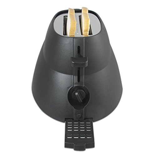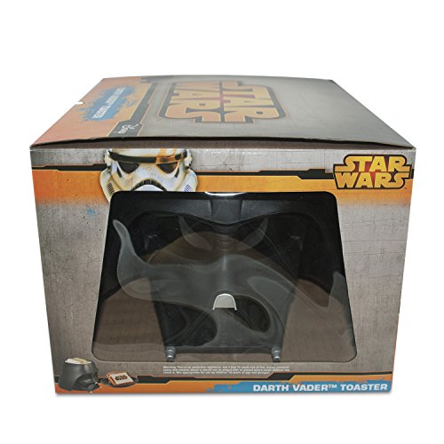 The Star Wars franchise is among the most recognizable brands on earth, with Darth Vader at the helm. Molded in sturdy black plastic and meticulously detailed, the Darth Vader Toaster will make a striking addition to any kitchen counter. Pop in two pieces of bread, frozen pancakes, hamburger buns or English muffins, and in moments Vader ejects them with the Star Wars logo toasted right on them. Like your toast on the darker side? A handy dial provides temperature adjustment. Measuring a hefty 12" X 10.7" X 8.4" and weighing in at 4.1 lbs. of mystery and menace, the imposing presence of Darth Vader will help eaters start their day feeling ready to take over the planet, and anything else that might get in their way.Feature