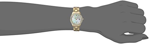 - Feature : Gold-tone dress watch with mother-of-pearl dial and Swarovski crystals around bezel / Solar technology harnesses natural light for lasting precision / Japanese quartz movement with analog display / Features protective Hardlex crystal dial window and deployment clasp / Water resistant to 99 feet (30 M): withstands rain and splashes of water, but not showering or submersion
