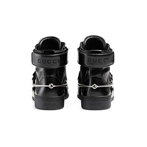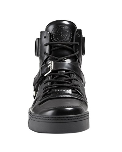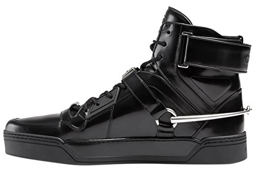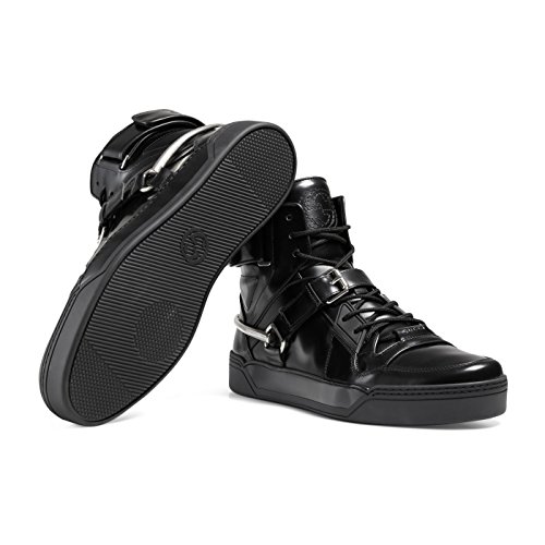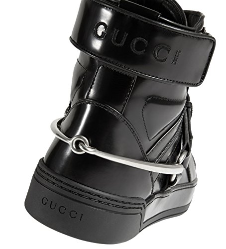 Binding : Apparel Product Description Gucci Men's Black Shiny Leather GG Horsebit High Top Sneakers ShoesHigh-top sneaker in leather with a high shine finish. Black shiny leather Made in Italy Lace-up with strap and buckle closure Interlocking G embroidered detail on tongue Adjustable Velcro strap at the ankle with Gucci logo Horsebit detail Rubber sole
