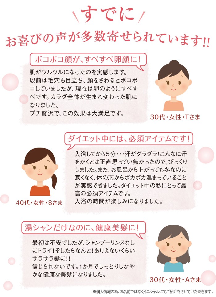 ※残り湯には無機塩類が含まれていますので植物の水やり等には使わないで下さい。