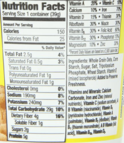 -. Feature : Made with 100% Whole Grain Oats / Can Help Lower Cholesterol* as Part of a Heart Healthy Diet / Simply Made. Grown. Milled. Toasted. / Gluten Free / 150 Calories per Container