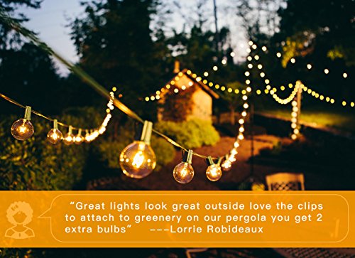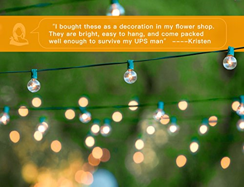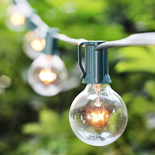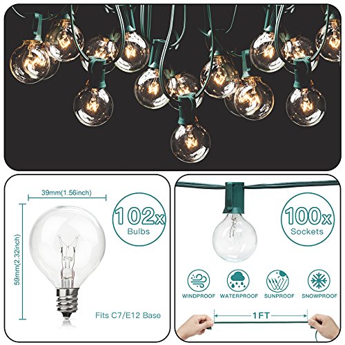 - 102 bulbs included(We put 2 free extra bulbs in the package as well for replacements. We are devoted to improve your purchase experience with us). Clear 5-watt G40 incandescent bulbs on a 50 feet long string.