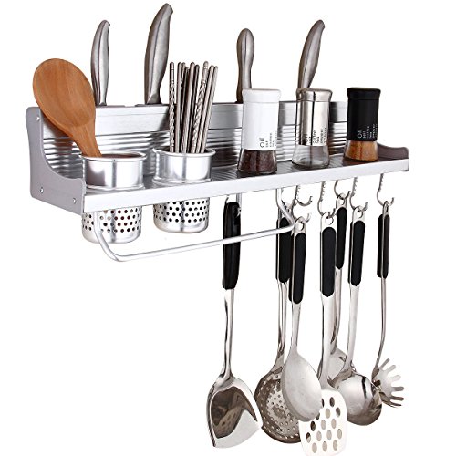 Kitchen Wall Organizer:10 hooks, 4 knife slots and the shelf space itself can store cups,tableware,spices,condiments,cans and jars.
