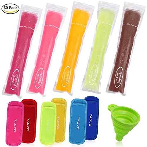 Tagvo 60 Pack Ice Popsicle Mold Bags with 6 Pcak Insulator Sleeves, Healthy Homemade Ice Pop Mold Bags with Foldable Funnel, BPA Free and FDA Approved Popsicle Bags