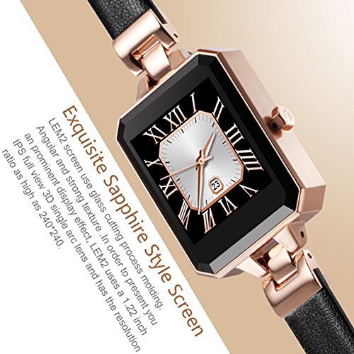 -. Feature : The world's first waterproof smart watch for female with heart rate monitor.The fit size brings the elegant appearance: Make LEM2 become your daily fashion ornament. / High resolution screen: LEM2 uses a 1.22 inch IPS full view 3D single arc lens and has the resolution ratio as high as 240*240. Angular and strong texture. In order to present you an prominent display effect. / LEM2 uses the watches grade of 316L aluminum metal and stainless steel CD screw rust-proof special material, combining the shining surface with drawing surface. Makes every edge angle and every arc line of LEM2 show the perfect art of steel. / Functions: Pedometer, Phone book, Calls reminding, Music player, Anti-lost alert, Sleep monitoring, Camera remote, Call answer, Find phone, Sync SMS, Sedentary, Reminder, Heart rate monitor, Sync Email, Calculator, Timer, Calendar, Gestrues awaken function. / It support both iOS and Android:Android 4.4 version or higher, iOS 8.0 version or higher.