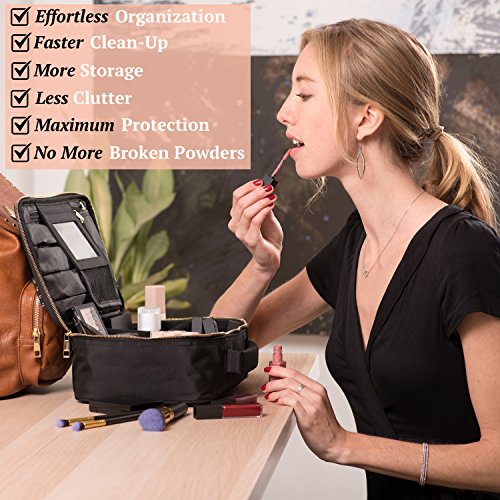 - [FITS ALL OF YOUR MAKEUP, PROTECTS YOUR POWDERS] - Ditch those 3 makeup bags you keep carrying around! Our innovative Three-in-One design allows you to store ALL of your cosmetics, makeup brushes, and toiletries in ONE portable cosmetic bag while our PowderSafe walls ensure you’ll NEVER find a cracked powder again.