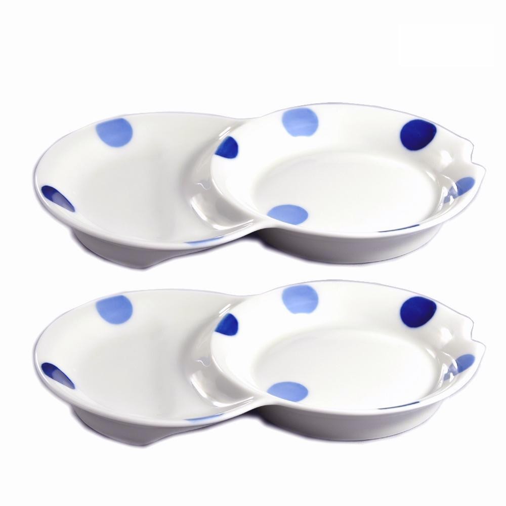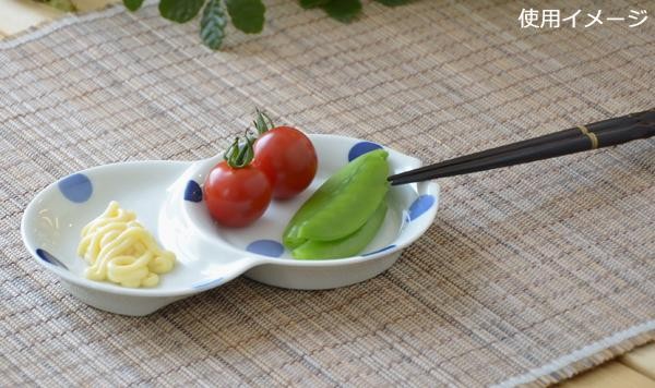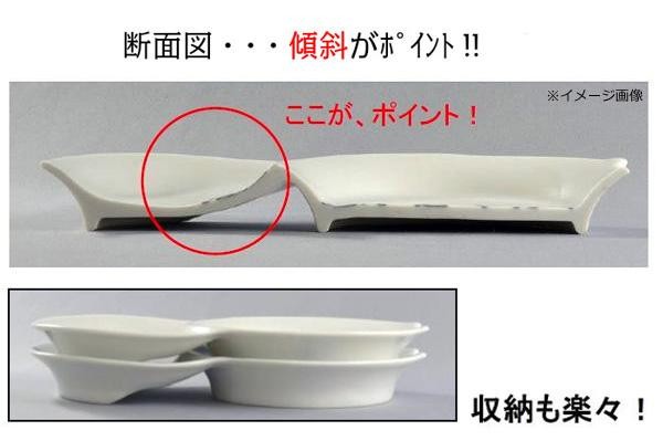 二種類のお料理やソースなどを盛ることができる、便利なお皿です。片方の皿はななめになっているので、お皿の傾斜を利用して、余分な醤油などを切ることができます。また、お皿のフチの一部が丸く欠けて、箸置きになっています。 |