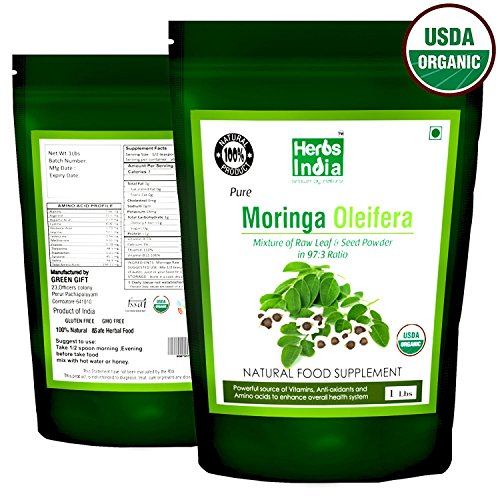Moringa Powder - Leaf and Seed Powder in (97:3) Ratio - USDA Certified Organic, all Natural - 16 Ounce (1 Pound) - Herbs India