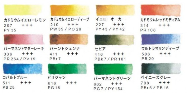 | セット内容 | ハーフパン12色・水彩画用筆(セーブル毛丸4号) 【セット配色】 ハーフパン/207、210、227、314、336、411、416、506、511、616、662、708 |