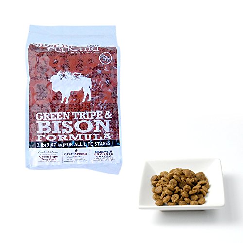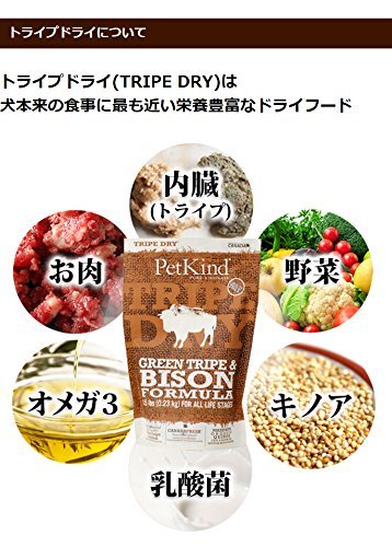 原材料:●原材料ビーフトライプ,バイソントライプ,ターキー,エンドウ,乾燥ターキー,ピープロテイン(エンドウタンパク質),乾燥鶏肉,ピースターチ(エンドウ澱粉),鶏脂肪(ミックストコフェロールで保存),レンズ豆,フラックスシード,ナチュラルフレーバー(鶏レバーオイル),キノア,カボチャ,ホウレンソウ,ニンジン,ブロッコリー,クランベリー,リンゴ,ブルーベリー,バナナ,第二リン酸カルシウム,炭酸カルシウム,塩化ナトリウム,塩化カリウム,サーモンオイル(ミックストコフェロールで保存),チコリ根,ビタミンA,ビタミンD3サプリメント,ビタミンE,ナイアシン,パントテン酸カルシウム,リボフラビン,硝酸チアミン,塩化ピリドキシン,葉酸,ビタミンB12サプリメント,ミネラル,硫酸亜鉛,硫酸鉄,亜鉛タンパク化合物,鉄タンパク化合物,硫酸銅,酸化マンガン,銅タンパク化合物,マンガンタンパク化合物,ヨウ素酸カルシウム,亜セレン酸ナトリウム,塩化コリン,タウリン,乾燥ラクトバチルス・アシドフィラス発酵産物,乾燥ラクトバチルス・カゼイ発酵産物,乾燥ビフィドバクテリウム・サーモフィラム発酵産物,乾燥ストレプトコッカス・フェシウム発酵産物,ユッカ根エキス,ローズマリー,唐辛子,ペパーミント,タイム,緑茶抽出物●保証分析値粗タンパク質32.0%以上、粗脂質16.0%以上、粗繊維質4.0%以下、水分10.0%以下、粗灰分8.5%以下、リン0.8%以上、マグネシウム0.10%以下、タウリン2790mg/kg以上、オメガ6 3.0% 以上、オメガ3 0.9% 以上
