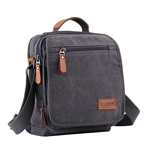 -. Feature : Dimensions: 10.6"/8.7"/4.7"(27*22*12cm )(L*W*H), Weight: 0.56KG/ 1.23 pounds. Tits up to 10" tablet / This small shoulder bag has 9 pockets, 7 of them zippered making the overall design extremely functional / Main Material of BLUBOON canvas shoulder bag: durable canvas and soft leather. The canvas material is very thick and durable very nicely made. The small leather accents on the zipper add a nice touch to the design / The stitching is nicely done and the zippers appear to be sturdy and don't get hung up. There are so many different compartments in this small canvas shoulder bag making the overall design extremely functional / This mens shoulder bag is stylish, functional, washable, and durable. It would work well for school, daily use, shopping, traveling, or for the gym, and it's amazing what it can hold