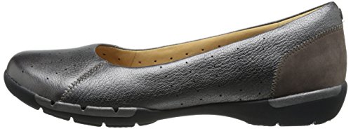 This Unstructured shoe is a joy to slip your foot into. Crafted from pewter metallic leather with luxe lambskin and suede linings, it features the innovative Air Circulation System, a unique climate control technology that keeps feet feeling fresh all day. A removable OrthoLite molded footbed, Clarks Plus intelligent underfoot cushioning, and lightweight EVA midsole with rubber outsoles add all day comfort. This easy to wear women's style has workplace polish and is a great choice for travel.Feature