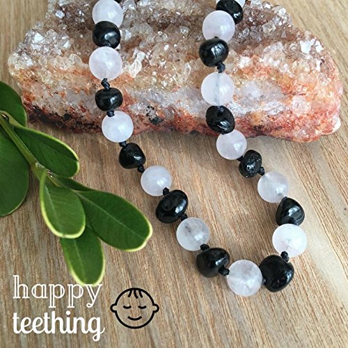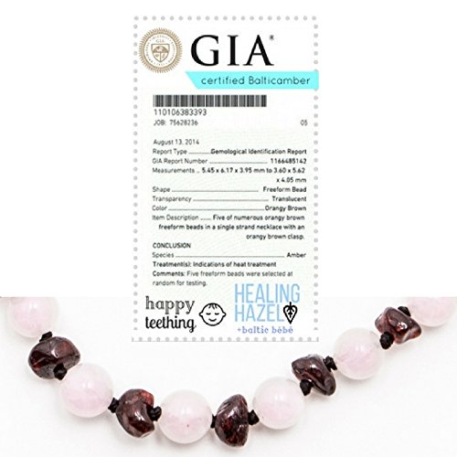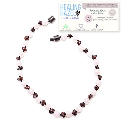 Healing Hazel + baltic bébé – 100% Certified Balticamber Pop Clasp Baby Necklace with Gemstones, Tender Rose Quartz, 11 inches (reduce drooling &...