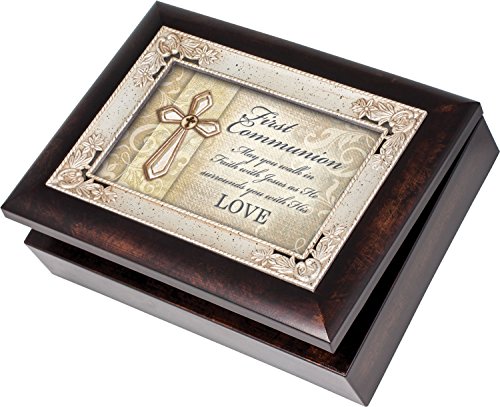 First Communion Cottage Garden Italian Style Burlwood Finish with Decorative Inlay Jewelry Music Box - Plays Song Amazing Grace