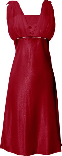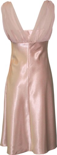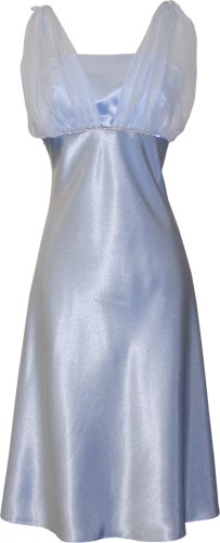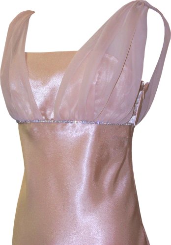 Pretty knee-length satin dress with spaghetti straps, chiffon overlay and prongset crystal trim. Matching chiffon shawl. Skirt is unlined.