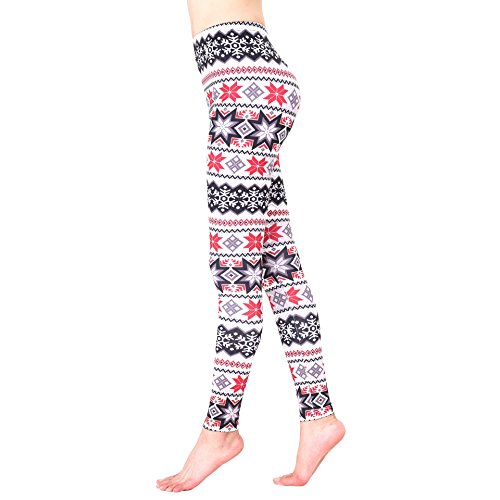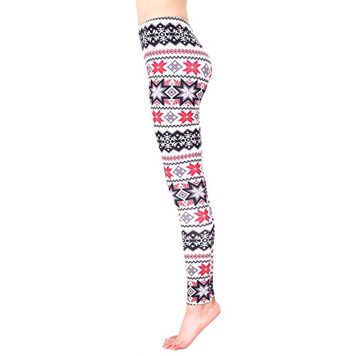 Ensasa Womens Autumn Winter Snowflake Graphic Printed Stretchy Leggings Pants, Red White, Medium