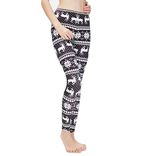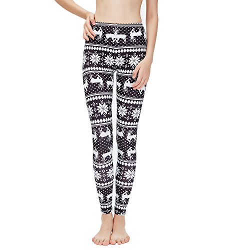Ensasa Womens Autumn Winter Snowflake Graphic Printed Stretchy Leggings Pants, Black White Reindeer Medium