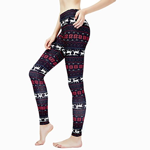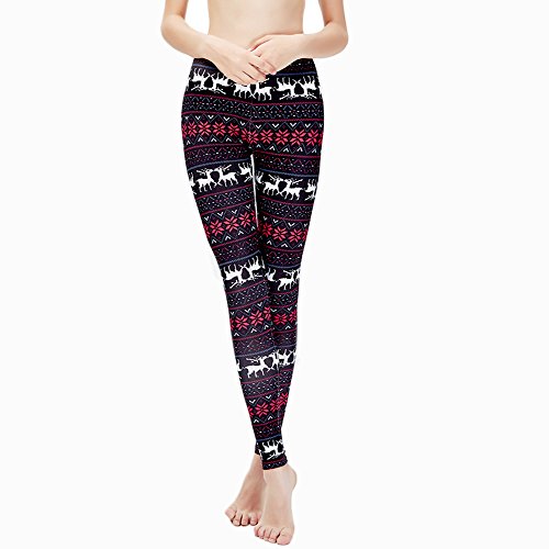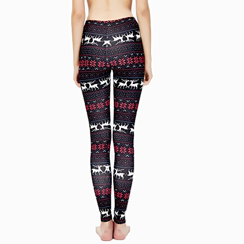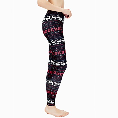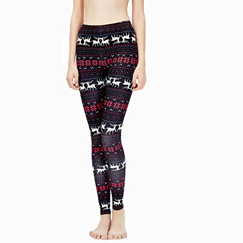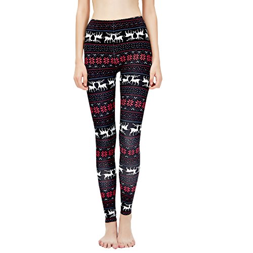 Ensasa Womens Autumn Winter Snowflake Graphic Printed Stretchy Leggings Pants, Black Red Reindeer Medium