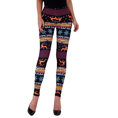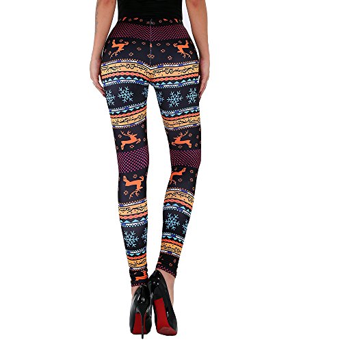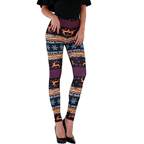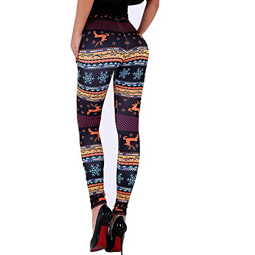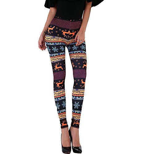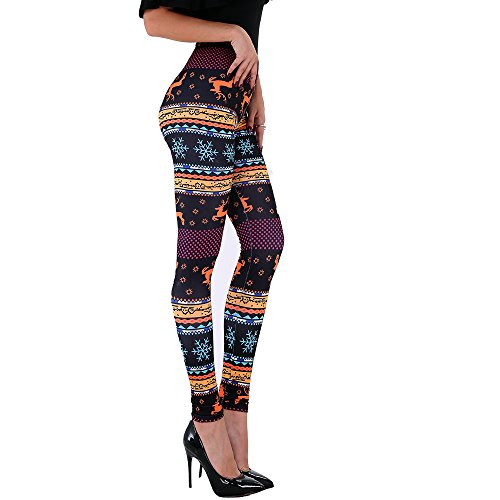 Ensasa Womens Autumn Winter Snowflake Graphic Printed Stretchy Leggings Pants (X-Large, Black Orange Reindeer)