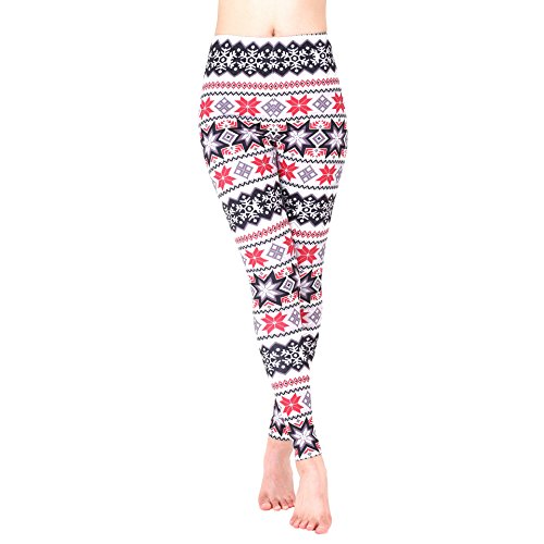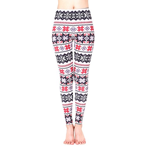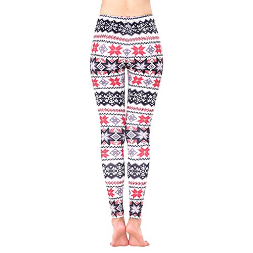 Ensasa Womens Autumn Winter Snowflake Graphic Printed Stretchy Leggings Pants (Medium, Black White Red Flake)