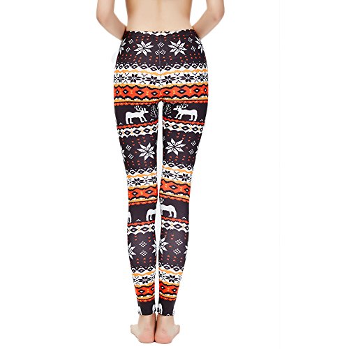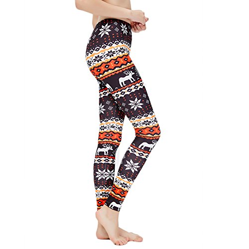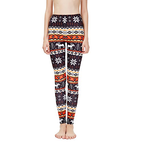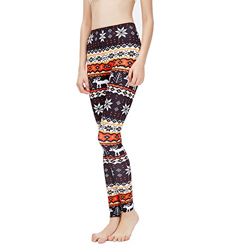 Ensasa Womens Autumn Winter Snowflake Graphic Printed Stretchy Leggings Pants, Black Orange Reindeer, Medium