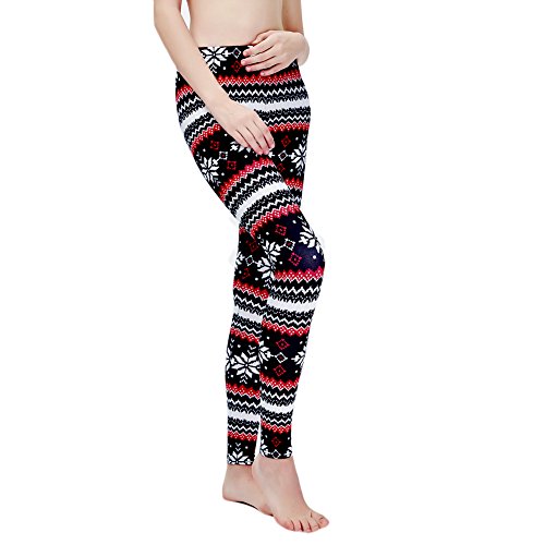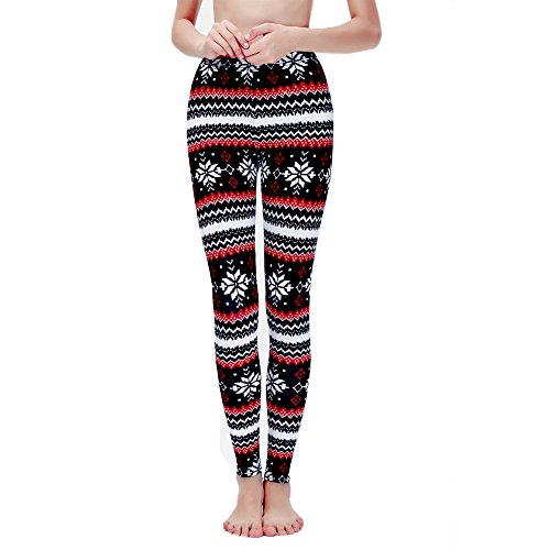 Ensasa Womens Autumn Winter Snowflake Graphic Printed Stretchy Leggings Pants, Black Red, Medium