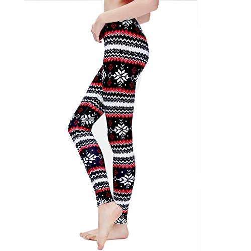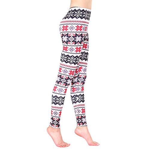 Ensasa Womens Autumn Winter Snowflake Graphic Printed Stretchy Leggings Pants (Small, Black White Red Flake)