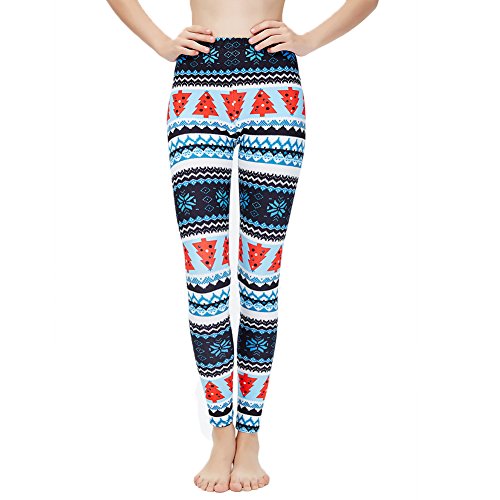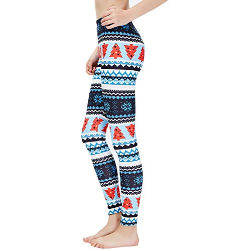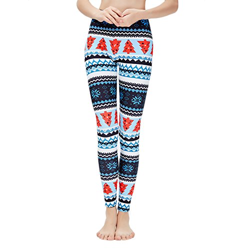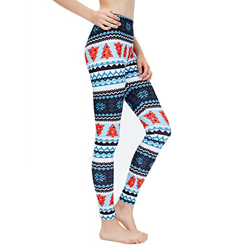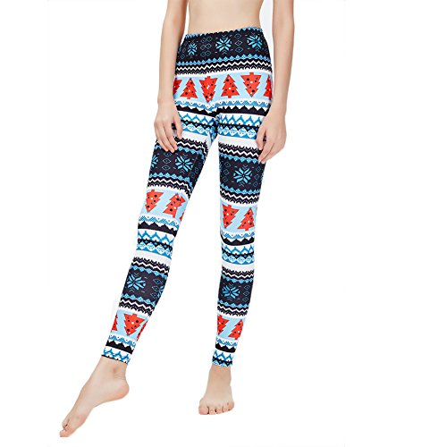 Ensasa Womens Autumn Winter Snowflake Graphic Printed Stretchy Leggings Pants, Blue Christmas Tree Medium