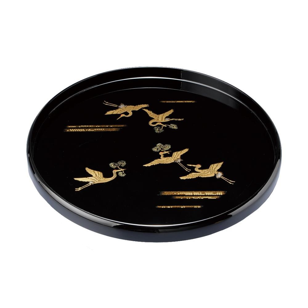 若葉をくわえ優雅に飛翔する鶴の姿は、藤原文化の時代より吉兆の印として愛され続けるおめでたい印です。気品に満ちた美しい丸盆です。