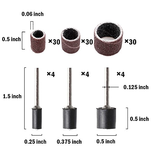 SIZE - Sanding bands size: 1/ 2, 3/ 8 and 1/ 4 inch .Drum mandrels size: 1/ 2, 3/ 8 and 1/ 4 inch with 1/ 8 inch shank