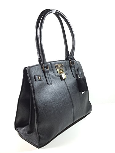 Body: 100% polyurethane. Lining: 100% polyester. 14" W x 6" D x 11" H Gold Logo Plate at center 9" handle drop No exterior pockets 3 interior pockets Comes with black logo dust bag for storage