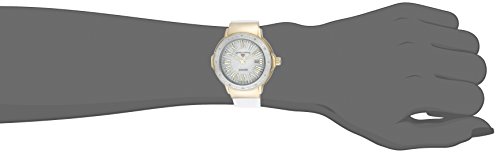 White mother of pearl dial with gold tone and white hands and gold tone roman numerals; luminous; gold tone ion-plated stainless steel case; white silicone strap