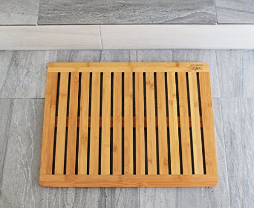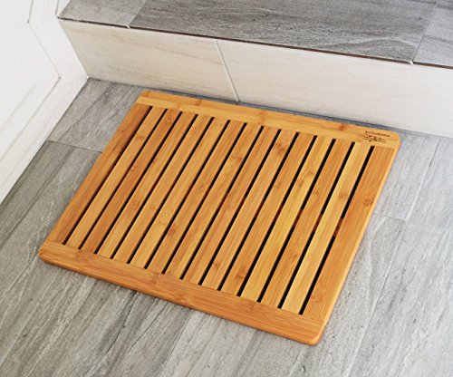 Studio : EcoTrueBamboo Publisher : EcoTrueBamboo Product Description Bathroom Mat by EcoTrueBamboo - Square Bamboo Bath Mat with Drain holes - Non Slip Bathroom Floors, Kitchen Decor, Pool Equipment, Shower Stalls and Bathtubs - Mold Mildew Resistant | Size 23" x 17" WATER RESISTANT DESIGN: This dynamic design promotes air circulation beneath your feet; allowing water to fall between the slotted hydrophobic panels. This prevents mildew and mold. The simple and elegant layout allows water to drip and evaporate safely under your mat - rather than splashing it around the room. Get dry quicker, Get fresh faster. 100% MASO BAMBOO SHOWER MAT: EcoTrueBamboo uses only the finest Moso Bamboo - quality that follows four key components: strength, density, durability and eco-friendly. This organic and premium natural quality translates into a hydrophobic and mold resistant mat. Our mats are kind to your feet - even kinder on the environment. INDOOR/OUTDOOR USE: Place in your kitchen, bathroom, hottub, pool, Jacuzzi, outdoor shower, garage door entrance, back yard, tub, or walk-in shower, Saunas. Use anywhere around the house to dry off in a hurry! NON-SLIDING, WET FREE, SAFE FLOOR MAT: This non-skid, slip free mat is elevated by soft rubber feet to better protect you and your floor. It's coated with a hydrophobic lacquer to help water slide off mat's panels onto the floor below. Use in homes with small children, seniors or anyone who requires the highest standards of safety and quality. Relax and enjoy the comfort of your bathroom space. DURABLE EASY-TO-CLEAN: Professionally constructed to last and can be easily rinsed off under warm water to clean, followed by air dry. large surface measures by 23.5" x17.5"x 1" 0