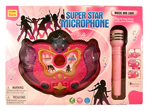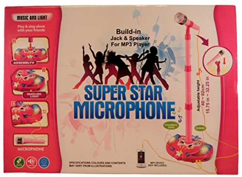 Super Star Microphone allows kids to sing alone or with friends! Adjustable height from 15.75" to 32.25". Built in jack and speaker for MP3 player, light and sound powered by 3 AA batteries, not included. For ages 3 and up.Feature