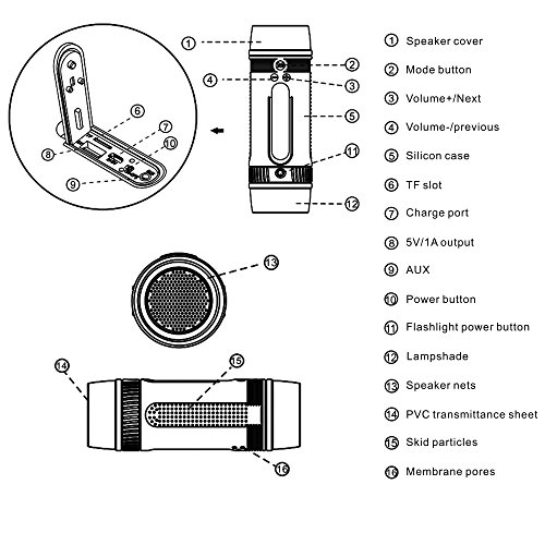 -. Feature : Easily Plays music with bass effect via bluetooth, Micro SD card (TF card) or FM radio; / Built-in 4000mAh battery, can output power to external devices via USB port as a powerbank; / 3 mode flashlight: high,low,strobe; Strobe mode can be used as warning or SOS in outdoor activities; / It can be easily mounted on the bike by bracket and Silicone protective sleeve ensure waterproof and shockproof; / Built-in latest bluetooth 4.0 technology works with virtually any bluetooth-enabled device (smartphones, tablets, PCs);
