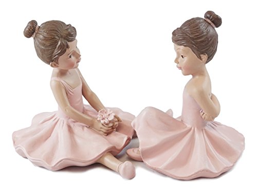 Features a set of ballerina girls wearing tutus; 1st girl is sitting with her legs out front, holding flowers & 2nd girl is sitting on her legs with her arms behind her back