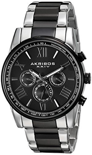 Studio : TWI Watches, LLC Publisher : TWI Watches, LLC Binding : Watch Product Description This exquisite AKRIBOS XXIV men's timepiece features a 41mm case with a two-tone stainless steel and black IP finish. A beautifully polished bezel frames a black dial that includes hand-applied Roman numerals, baton markers, and sub-dial rings. This multifunction timepiece is powered by an ISA Swiss quartz movement, and its complications include day, date, and 24-hour indicator. It comes complete with a matching two-tone stainless steel link bracelet. 0