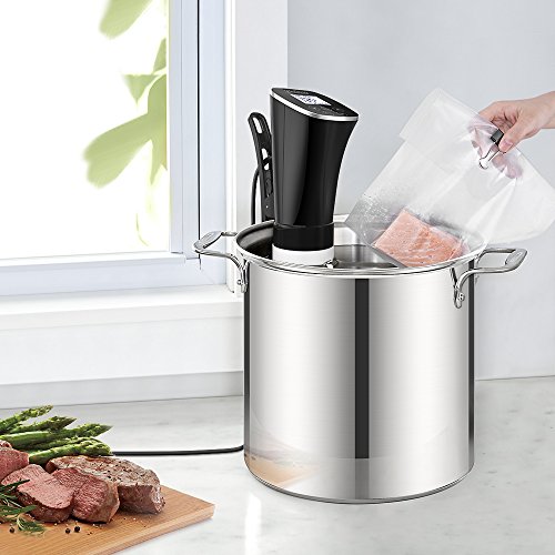 4.Container requirements: only heats and circulates water in the pot from 8 to 10 litter pot cooking food with a precise temperature. Cook everything from meats, fish and vegetables to soups, and desserts.