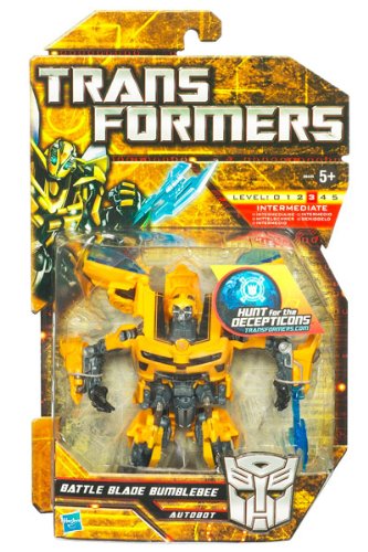-. Binding : Toy -. Brand : Transformers -. EAN : 0890745370557 -. Feature : Gear up for an intense robot battle with this Bumblebee figure / Ready to face down his toughest opponents when you flip down his battle mask and make him wield his converting battle-axe accessory / Convert him to Camaro concept car vehicle mode / He can tear down the streets in hot pursuit of any fleeing adversaries / Converts from robot mode with converting battle-axe accessory and flip down battle mask accessory to Camaro concept car vehicle mode -. IsAdultProduct : 0 -. Label : Hasbro -. LegalDisclaimer : Item is sold as is. No refunds or exchanges. -. Manufacturer : Hasbro -. Model : 98449 -. MPN : 98449 -. PackageQuantity : 1 -. PartNumber : 98449 -. ProductGroup : Toy -. ProductTypeName : TOYS_AND_GAMES -. Publisher : Hasbro -. SKU : QW-4SFE-6052 -. Studio : Hasbro -. Title : Transformers Deluxe Movie Collection - Battle Blade Bumblebee -. UPC : 653569493006