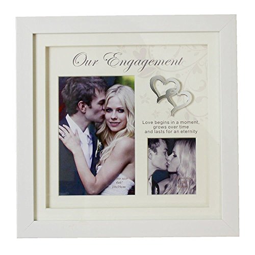 Smooth and simple white frame with beautifully illustrated ivory mount, featuring silver heart motif and romantic quote:"Our Engagement - Love begins in a moment, grows over time and lasts for an eternity".
