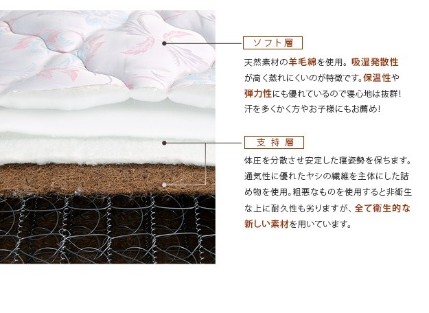 中身:ウレタンフォーム、パームパッド、ポリエステル綿、防虫不織布、羊毛