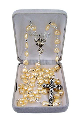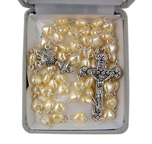 Catholic White Heart Prayer Bead Rosary Necklace with Heart Detailed Crucifix, 26 Inch